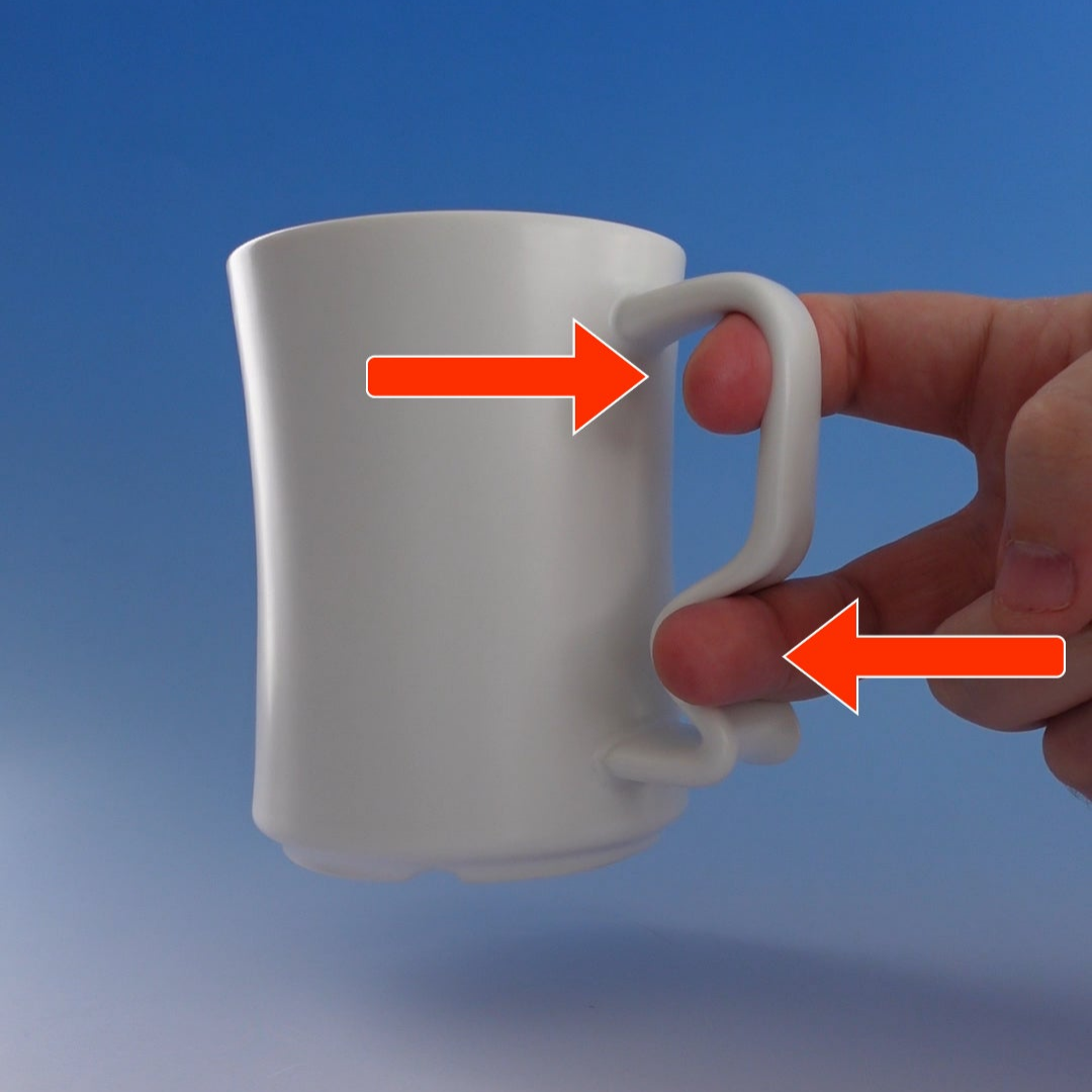 That's because the handles are curved almost perfectly to slip through your fingers. To keep the mug level, many people do one (or more) of the following: